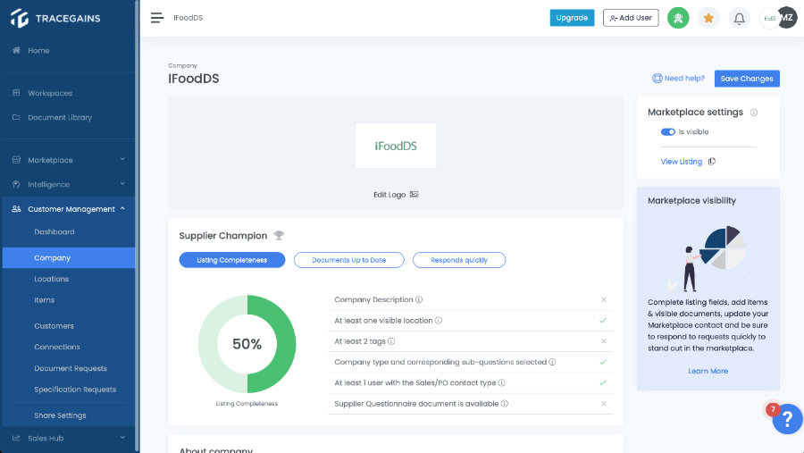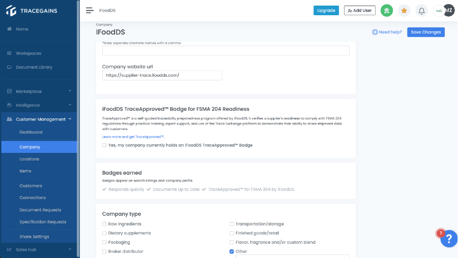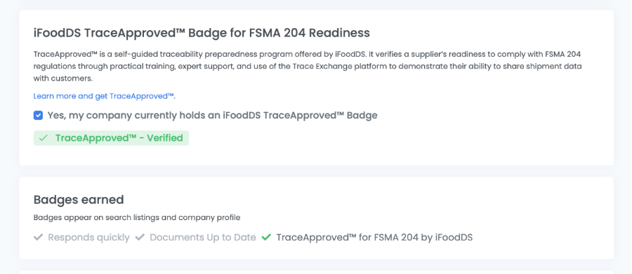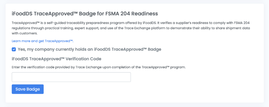 - Check the box next to “Yes, my company currently holds an iFoodDS TraceApprovedTM Badge”.