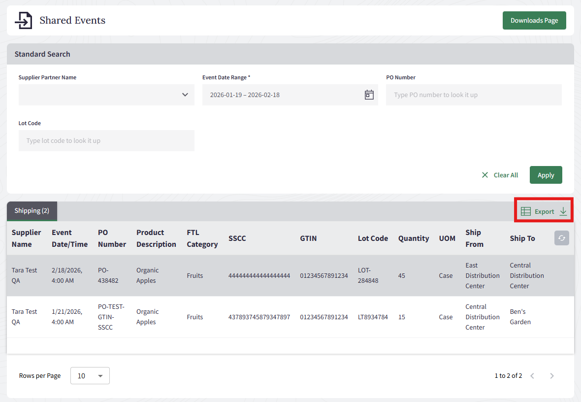 The Shared Events table allows you to view shipping events that have been shared with your organization by connected suppliers. You can export this data to a CSV file for external analysis, reporting, or record-keeping.