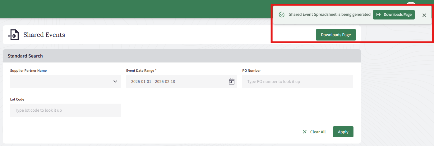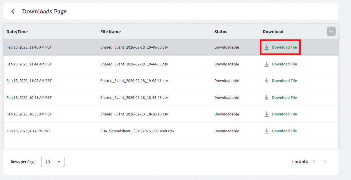 Exports reflect exactly what is visible in the Shared Events table at the time of download, including any filters applied.