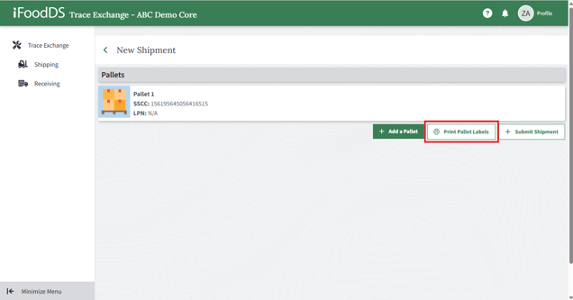 To print pallet labels using Trace Exchange, you will need to create a new shipment using the Trace Exchange Shipping App.
