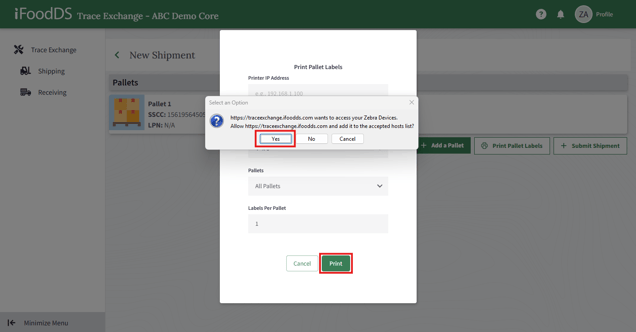 - A Pallet Label Configuration screen should appear as well as a web browser prompt asking to add Trace Exchange as an accepted host. Click the Yes button. If the web browser prompt does not appear immediately, try clicking the Print button on the Pallet Label Configuration screen.