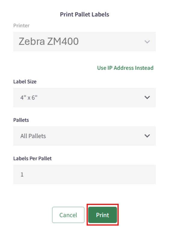- On the Pallet Label Configuration screen, ensure your printer is selected and designate your preferred label size, which pallets you need labels for and number of labels per pallet. When ready, click the Print button.