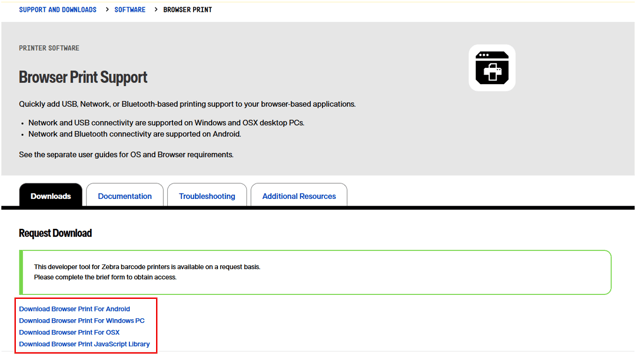 - On the desktop device that you intend to use to print pallet labels, follow this link and download the Zebra Browser Print application. Ensure you download the appropriate version of Browser Print based on your desktop's operating system (Windows PC version for Windows devices, OSX version for Mac devices).