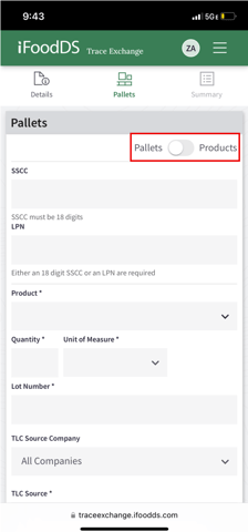 - Follow the steps to record a new Shipment found here. When adding products to your shipment, ensure that the slider in the top right corner of the Product Details page is set to Pallets. This allows you to enter pallet SSCC information for each pallet.