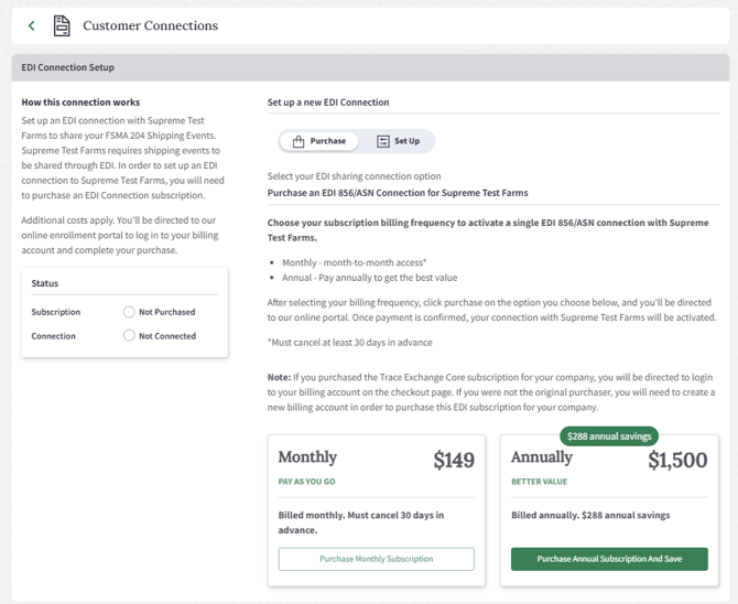An EDI subscription can only be purchased on a Trace Exchange Core account. If you are currently using Trace Exchange Data Link, you will need to upgrade to Trace Exchange Core to access and purchase EDI connections.