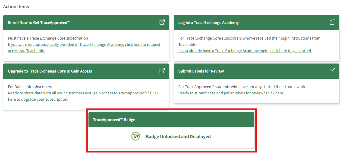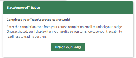 After completing the TraceApproved™ course, you will receive a completion email containing a unique completion code. This code is used to unlock your TraceApproved™ Badge within Trace Exchange.