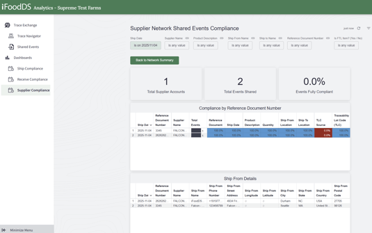 Locate the Trace Exchange Supplier Compliance dashboard in the Analytics section when logged into your iFoodDS Trace Exchange Account. Use this dashboard to review which suppliers are sharing shipping records with you and if those records align with the FSMA 204 requirements for Key Data Elements (KDEs). This dashboard helps identify overall completeness of the shipping events shared with you from your connected suppliers. You can also drill deeper into recent activity and event level completeness.